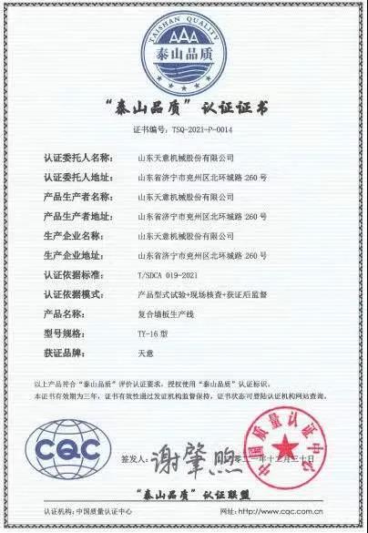 近日,山東天意機械股份有限公司榮獲“泰山品質(zhì)”認證證書,這是濟寧市企業(yè)繼山東如意毛紡服裝集團股份有限公司、通亞汽車制造有限公司之后,再次獲得“泰山品質(zhì)”認證證書。