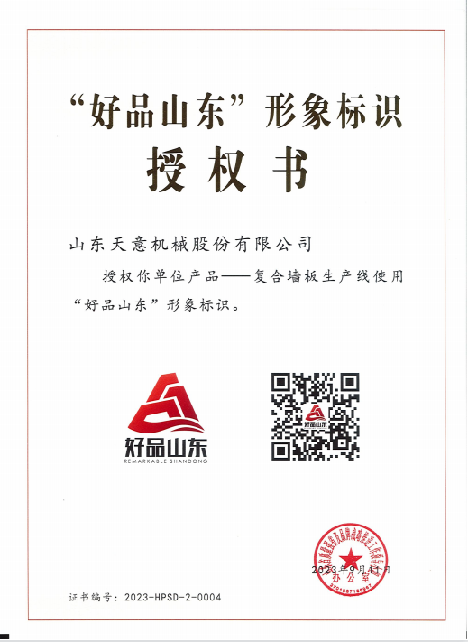 9月12日,由山東省市場(chǎng)監(jiān)管局會(huì)同省委宣傳部、省發(fā)展改革委、淄博市政府共同主辦的山東省2023年“質(zhì)量月”啟動(dòng)儀式在淄博舉行?;顒?dòng)發(fā)布第二批“好品山東”品牌遴選名單,共計(jì)105個(gè)品牌,天意機(jī)械憑借復(fù)合墻板生產(chǎn)線入選“好品山東”品牌遴選名單。