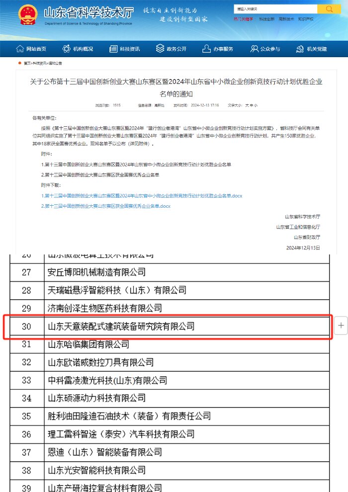 日前,山東省科技廳會同有關(guān)單位共同組織實(shí)施了第十三屆中國創(chuàng)新創(chuàng)業(yè)大賽山東賽區(qū)暨2024年“建行創(chuàng)業(yè)者港灣”山東省中小微企業(yè)創(chuàng)新競技行動計劃,山東天意裝配式建筑裝備研究院有限公司成功入選優(yōu)勝企業(yè)。