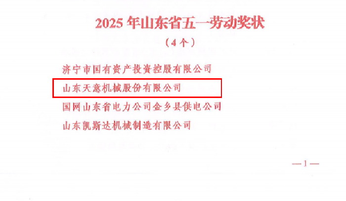 喜報丨熱烈慶祝天意機(jī)械榮獲“山東省五一勞動獎狀”