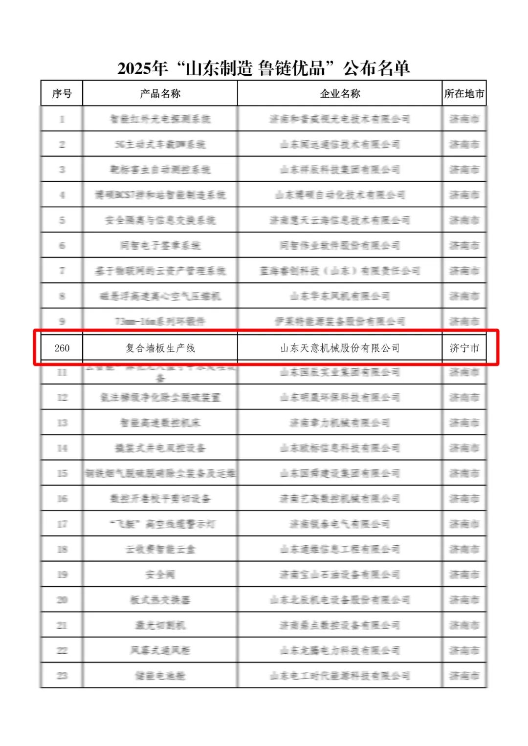 近日,山東省工業(yè)和信息化廳公布“山東制造·魯鏈優(yōu)品”品牌名單,山東天意機械股份有限公司自主研發(fā)的復(fù)合墻板生產(chǎn)線成功入選,標志著公司在綠色建材裝備領(lǐng)域的創(chuàng)新實力與產(chǎn)業(yè)鏈引領(lǐng)地位再獲權(quán)威認可。 “山東制造·魯鏈優(yōu)品”評選旨在聚焦省內(nèi)優(yōu)勢產(chǎn)業(yè)鏈,培育一批質(zhì)量卓越、技術(shù)領(lǐng)先、管理精細的標桿產(chǎn)品與企業(yè)。天意機械憑借在裝配式建筑裝備領(lǐng)域的持續(xù)深耕,其復(fù)合墻板生產(chǎn)線以高度自動化、節(jié)能環(huán)保、穩(wěn)定高效等特點脫穎而出,成為推動建筑產(chǎn)業(yè)現(xiàn)代化的重要力量。