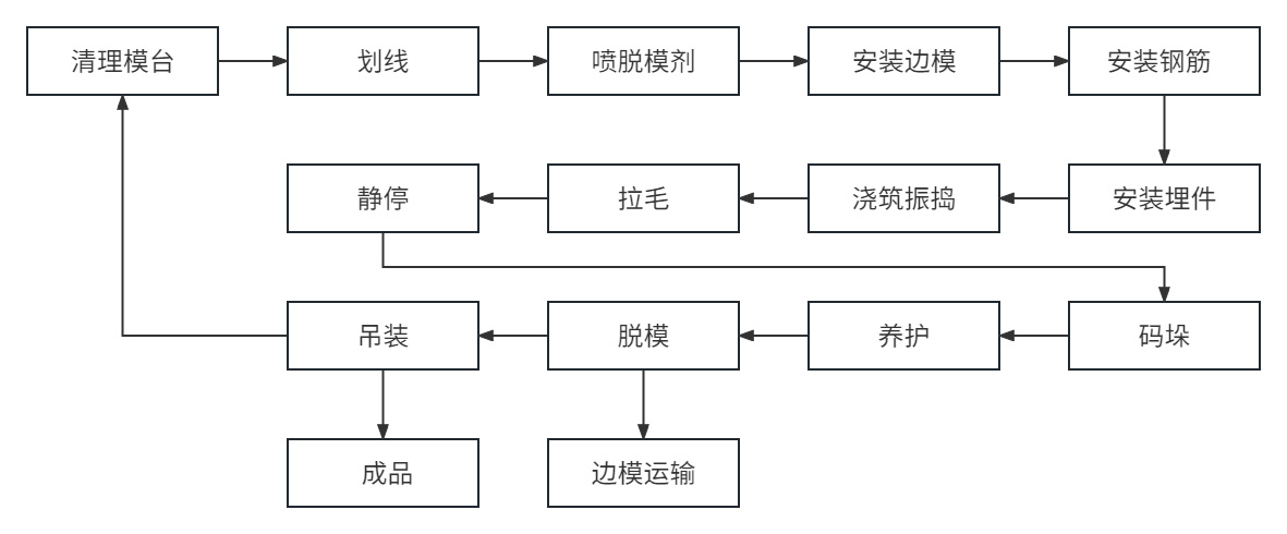 PC環(huán)形疊合板生產(chǎn)工藝主要由清理模臺、噴脫模劑、劃線、安裝邊模、安裝鋼筋、安裝埋件、澆筑振搗、拉毛、靜停、碼垛、養(yǎng)護、脫模、吊裝等工藝組成。