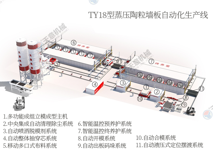 近年來,混凝土空心墻板發(fā)展迅速,究其原因是其原材料水泥和粗細骨料易于購買,生產(chǎn)效率高能夠?qū)崿F(xiàn)半機械化或者機械化生產(chǎn)等因素。其中陶?;炷翍?yīng)用于輕質(zhì)隔墻板中,能夠進一步提高輕質(zhì)隔墻板的性能,因此在天意機械的客戶中生產(chǎn)陶粒墻板的客戶也是越來越多,下面主要為大家介紹一下陶?;炷翂Π宓呐浞奖壤皦Π鍣C生產(chǎn)工藝。