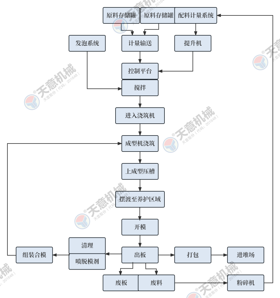TYF-16A型復(fù)合墻板生產(chǎn)線是天意機(jī)械公司綜合國(guó)內(nèi)外技術(shù)經(jīng)驗(yàn),開發(fā)研制的新型墻體板材生產(chǎn)線。復(fù)合墻板生產(chǎn)線主要分為配料系統(tǒng)、攪拌系統(tǒng)、發(fā)泡系統(tǒng)、數(shù)控配電系統(tǒng)、墻板成型系統(tǒng)、料漿泵送系統(tǒng)、EPS預(yù)發(fā)系統(tǒng)、液壓循環(huán)系統(tǒng)、整體出板系統(tǒng)。